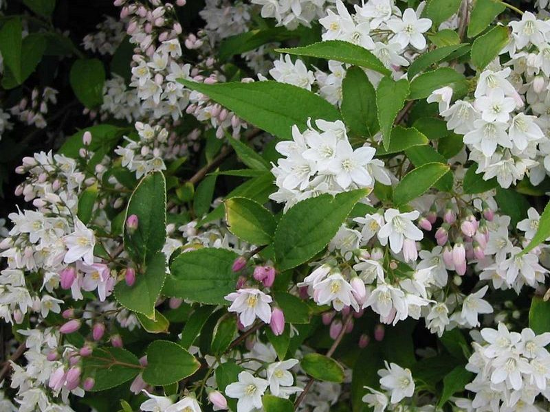 Высота взрослого растения достигает 1-3 метра, что позволяет использовать его как в одиночных посадках, так и в групповых композициях. Листья дейции имеют насыщенный зеленый цвет, который сохраняется на протяжении всего сезона, создавая яркий контраст с цветками.