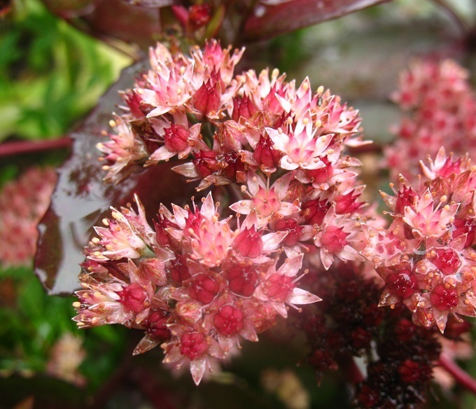 Очиток телефиум 'Бон Бон' неприхотлив в уходе и отлично переносит засуху, что делает его идеальным выбором для солнечных участков. Он прекрасно смотрится как в одиночных посадках, так и в композициях с другими многолетниками и декоративными травами.